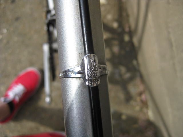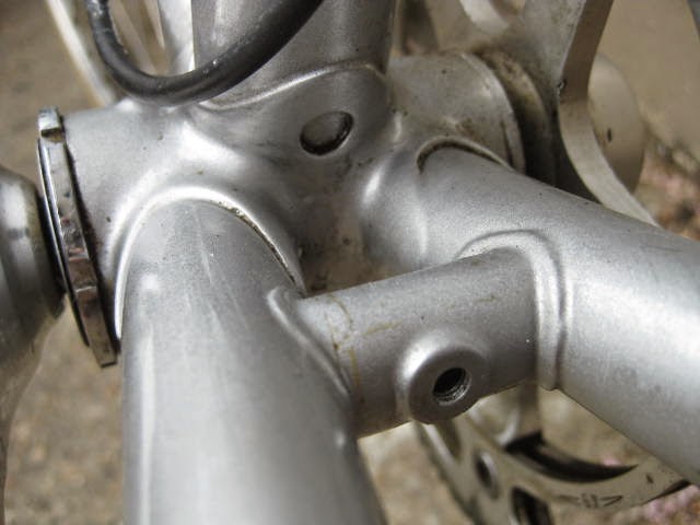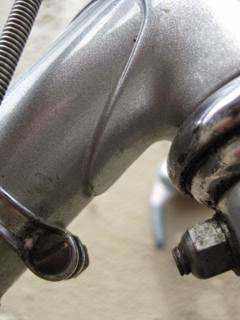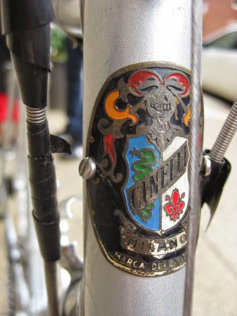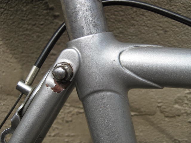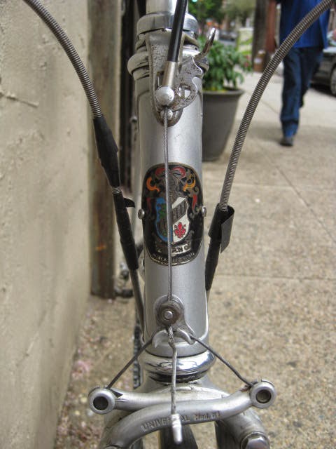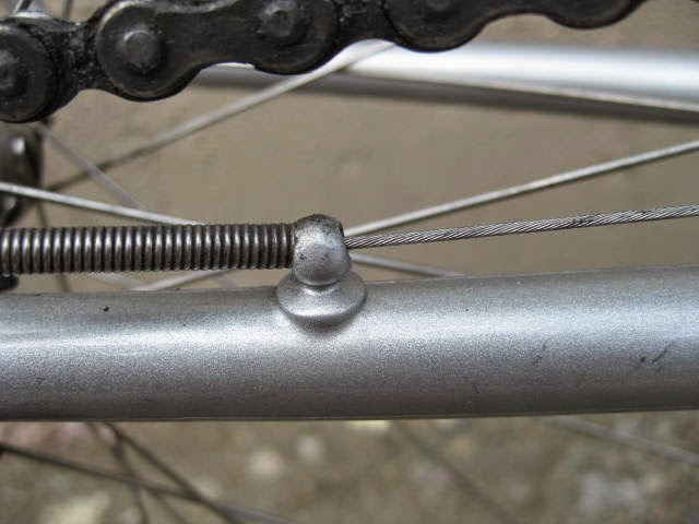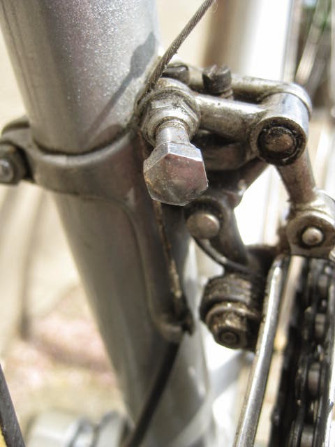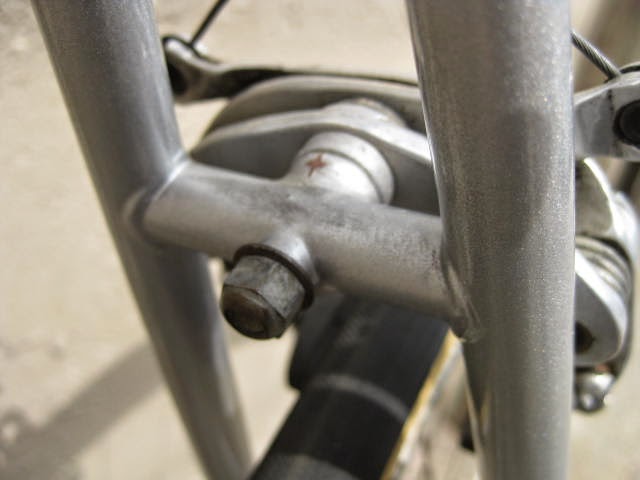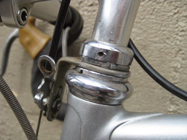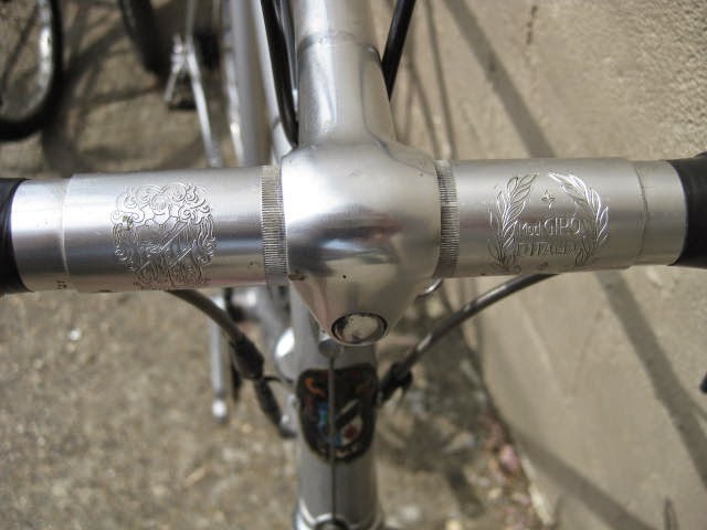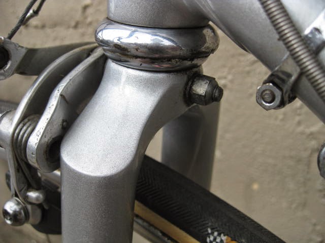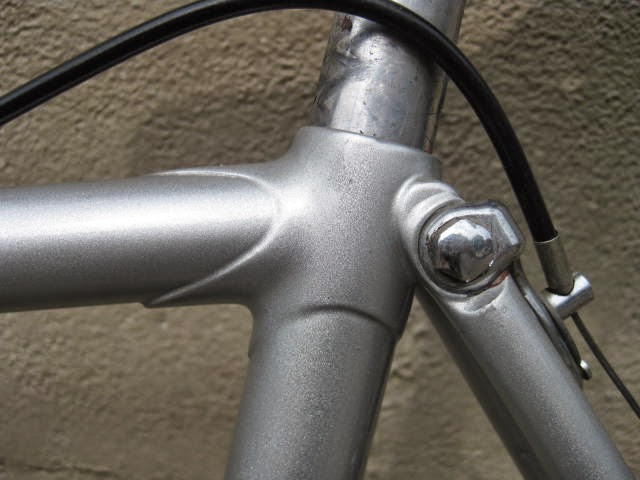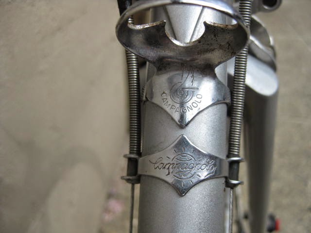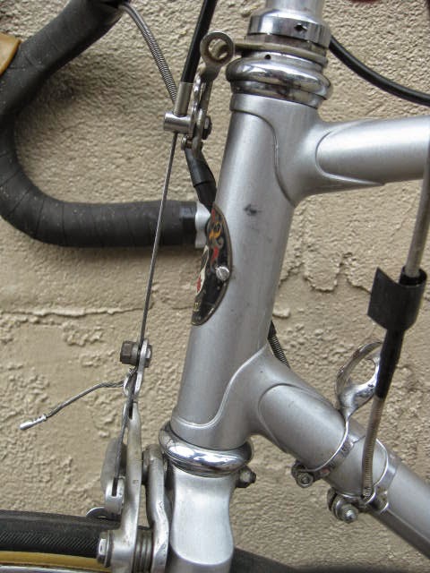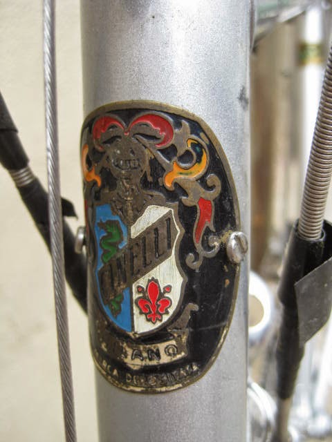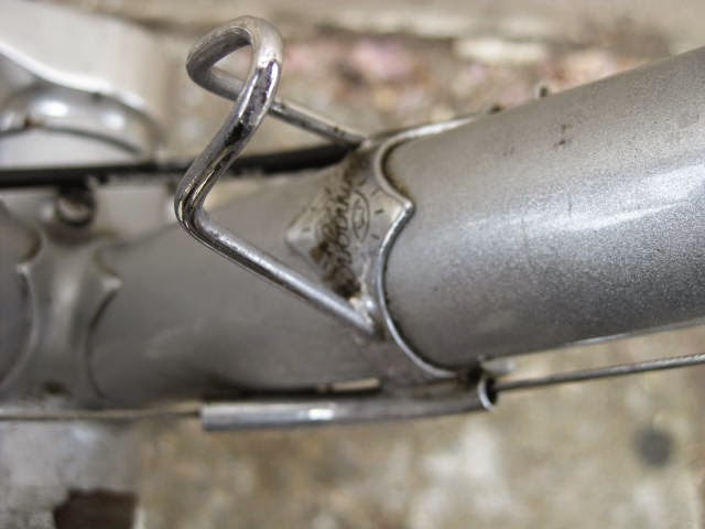 The bike also has the rare Cinelli head set (missing the even rarer steel Cinelli spacer), which were discontinued in the mid 1960’s. The frame also has the rare universal rear cable hanger, specific to the Cinelli seat cluster. When the bike was refinished apparently they lost the original head badge screws and used a bit larger diameter ones to secure the badge, Doh! I took them off and it is not bad underneath, they were careful at least. The badge is the 51mm enameled brass version.