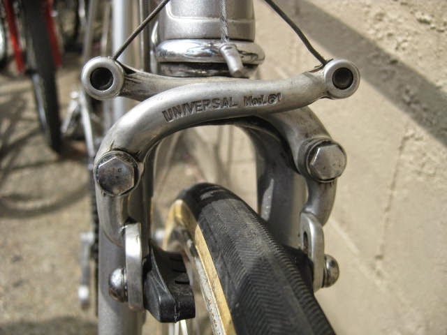The bike also has other cool features such as the Model 55 drilled plastic Unicanitor saddle, front Campagnolo derailleur with cable stop (slotted), no date code Campagnolo cranks, Universal Mod. 61 brakes, Campagnolo cable guide / pump peg, and Campagnolo double DT cable stop. Older logo Cinelli stem (90mm), and Cinelli crest logo Mod. Giro D Italia bars (alloy).