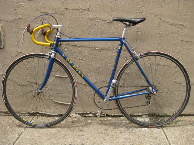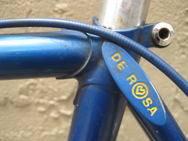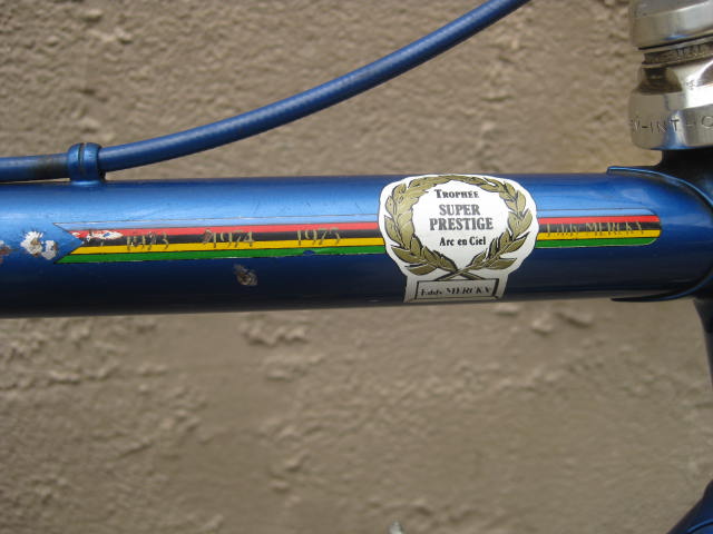 Another nice bike we recently acquired offered for sale today. It is a De Rosa from the mid 1980’s I believe. Dating these bikes is a bit difficult because frame features overlap and sometimes old fittings were used on newer bikes. Plus De Rosa was never really a high output operation until more modern times, focusing more on custom builds or bikes for racing teams / individuals. The frame is built with Columbus tubing. it also has the sloping fork crown which is an 80’s feature as well as the recessed, six slotted BB shell. The bike has all its original paint and decals, including the Trophee Super Prestige Arc En Ciel decal on the top tube with Eddy Merckx’s name and the dates of 1973-1975. The measurements are as follows: