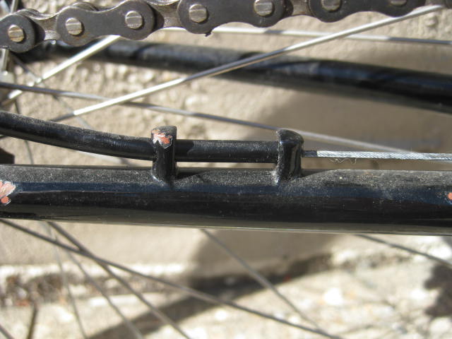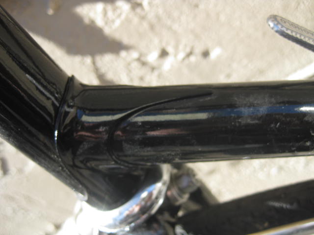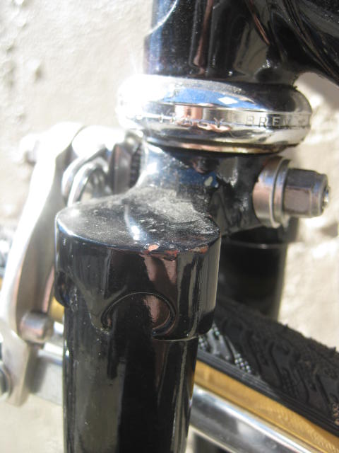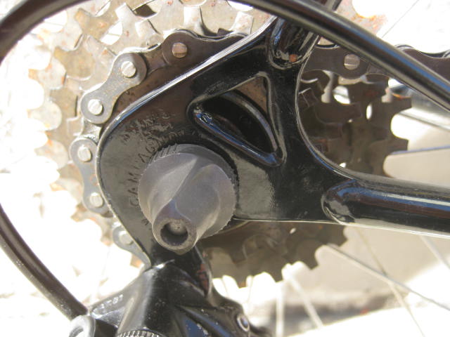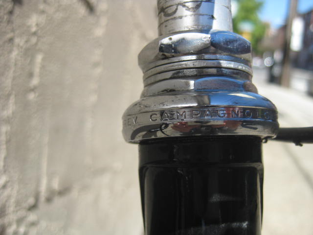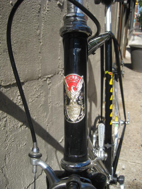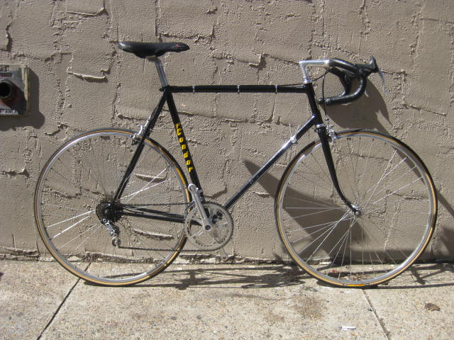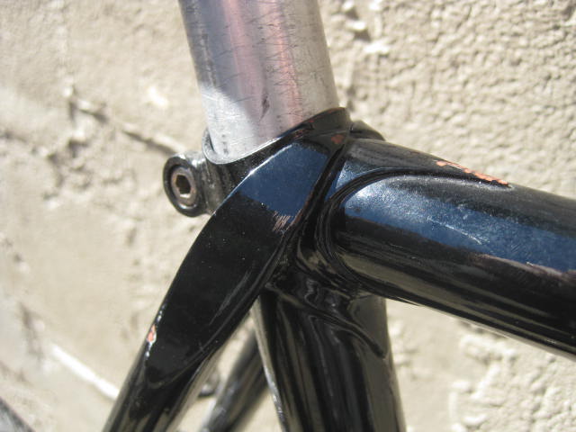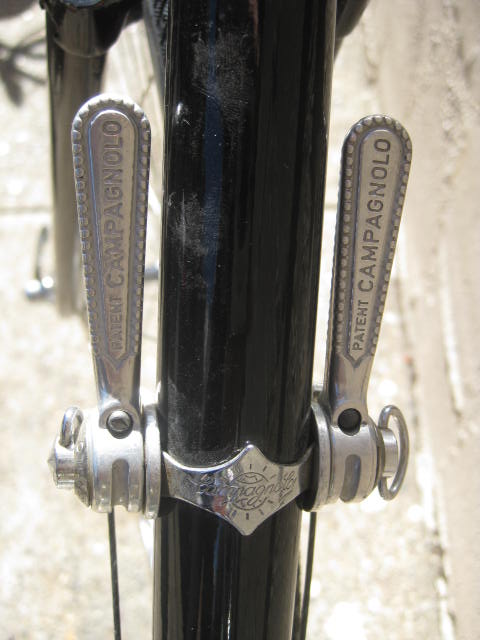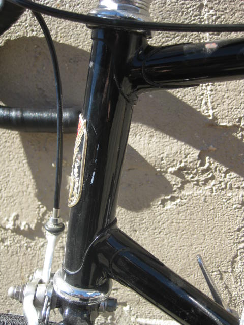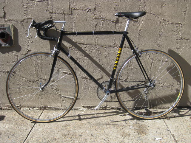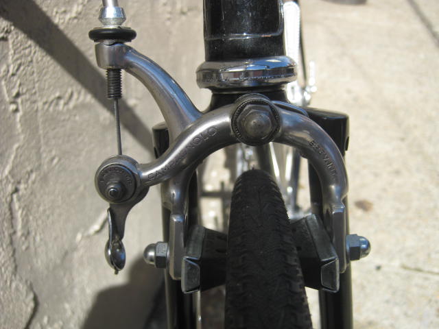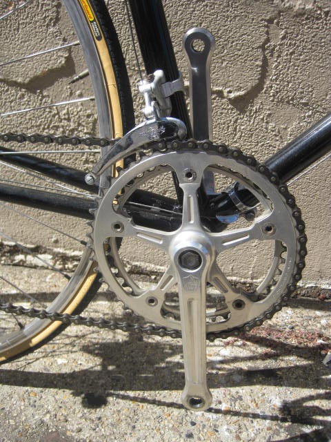 This bike is from the early to mid 1980’s I believe. Nice lugged construction with long points on the lugs and almost fully wrapping seat stay caps. It also is built with Campagnolo vertical drop outs. I am not sure if it is a re-paint or not. Nice gloss black finish. The measurements are as follows: