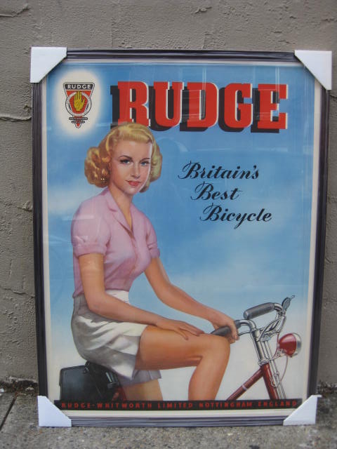 This is an amazing Rudge poster we recently got. It is from the late 1950’s – early 1960’s. The dimensions are 31′ wide by 41″ tall. We promptly got it framed, and it looks wonderful. The condition is perfect, the colors are beautiful, and the content and typography are great. We also have a Raleigh poster that is identical in size and subject matter. The Raleigh poster is more sexually suggestive. I like this one much better because it is more subtle and wholesome. Sex being used to sell bicycles is nothing new and there is a lot of more crass examples out there. enjoy the photos!