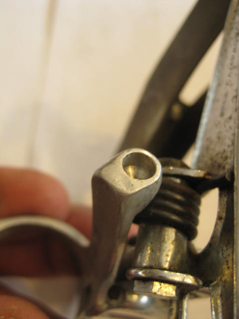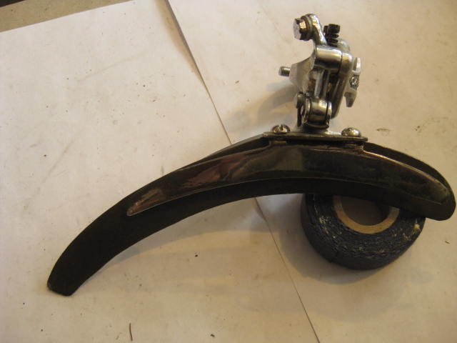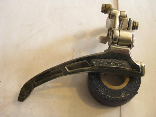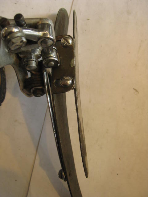 I find things while looking for other things on a daily basis around here. These items are a good example. These are two front derailleurs which have been modified to enhance their performance, I think. The first is the Campagnolo one which has had a much larger cage, (which has an adjustable outer plate) bolted to the stock inner cage plate. This was done, I assume to use a very small inner chain ring with a larger outer. My only question is: What was done to the rear derailleur to compensate for all those extra chain links?! Also of note is that this derailleur is an early version with the unslotted cable stop and bronze arms! The Second is a Suntour Cyclone which also has had the cage elongated for the same purpose. It was done by brazing on an additional length of cage to the existing one. Both are home spun solutions to a problem. I wonder if the creators got the desired results? One way to find out I guess…