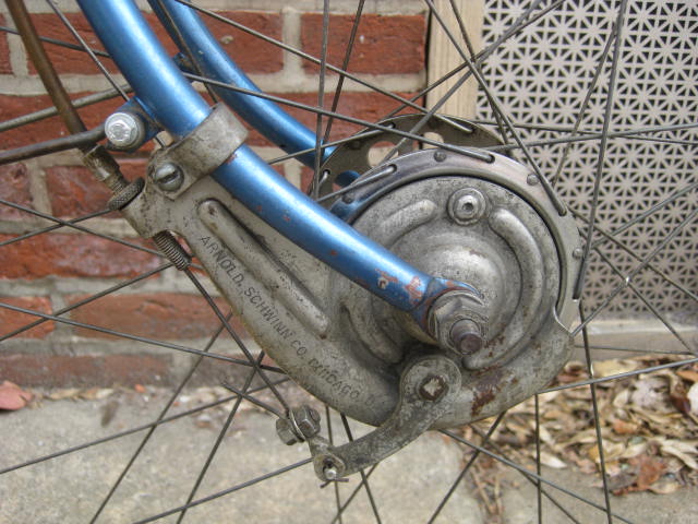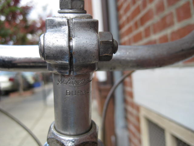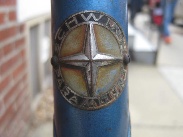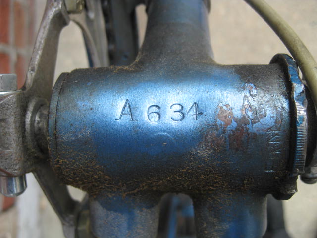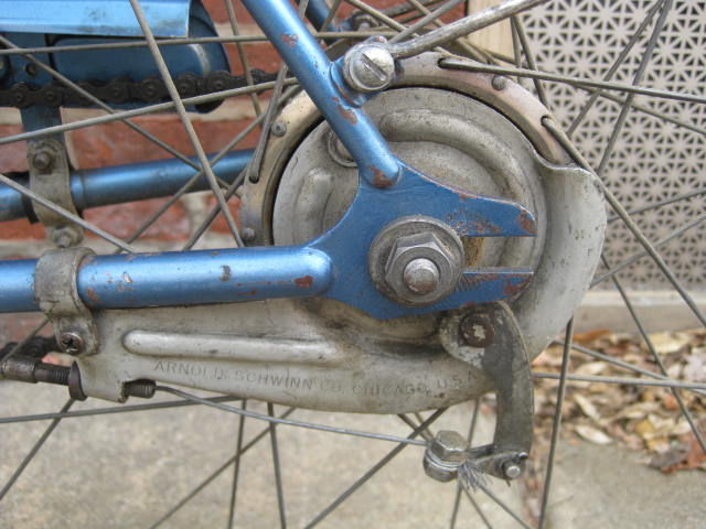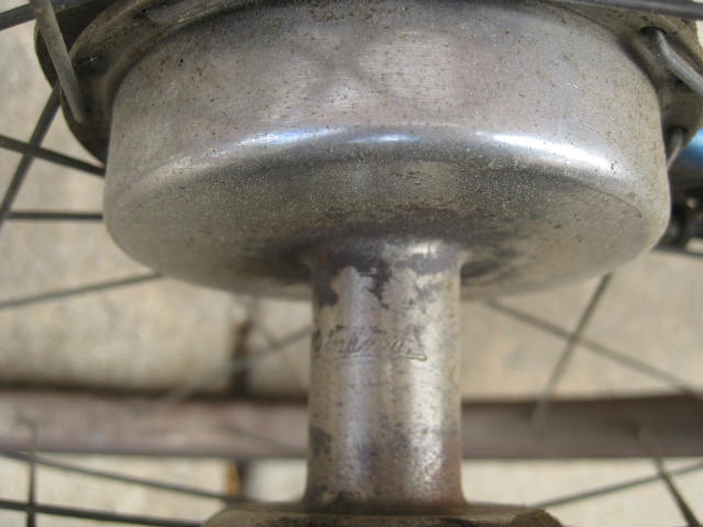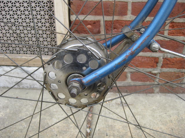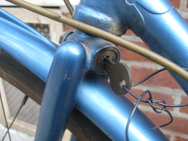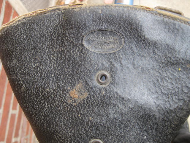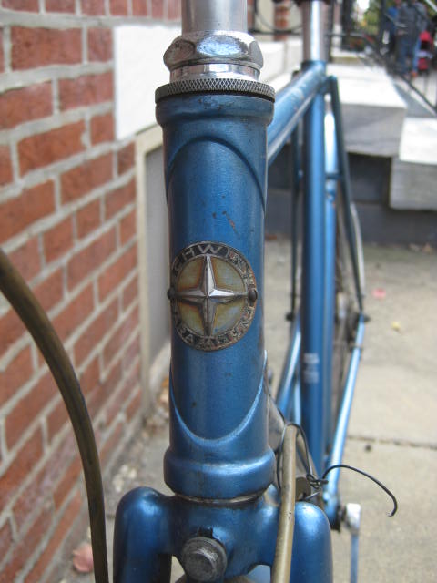 This bike is really cool. It is a Schwinn Paramount tourist model, serial number A634. This is the first serial number system started by Emil Wastyn and the earliest models follow this system. The letter A followed by three digits. This bike dates from roughly the early 1940’s. It was re-painted at some point in its life and has no decals. It does retain the original headbadge. It has the early ball end seat stay caps and the locking Schwinn Superior fork with key. The braze-ons are also attached above the drop outs for the original fenders. The hubs are the post war pork chop drum brake version.