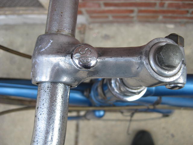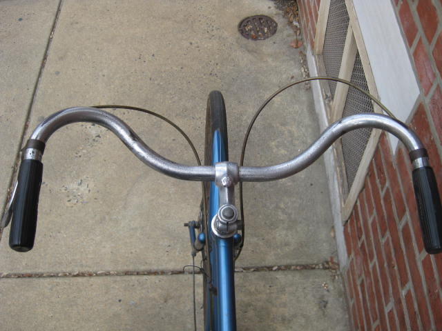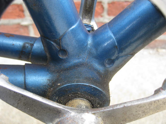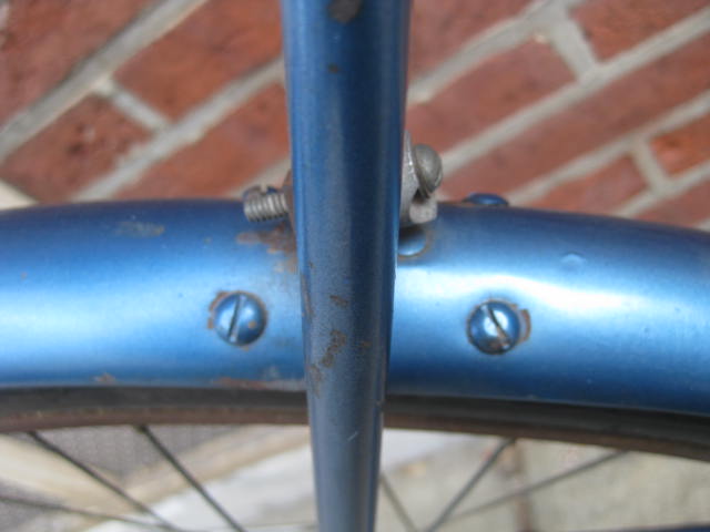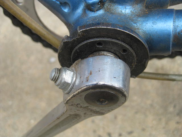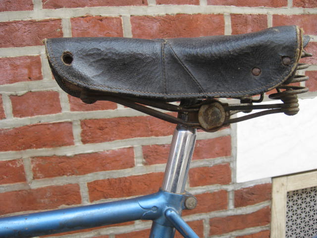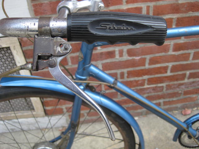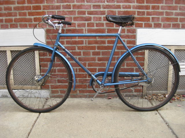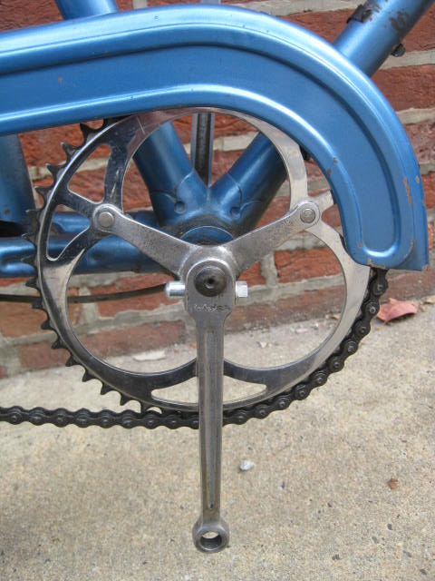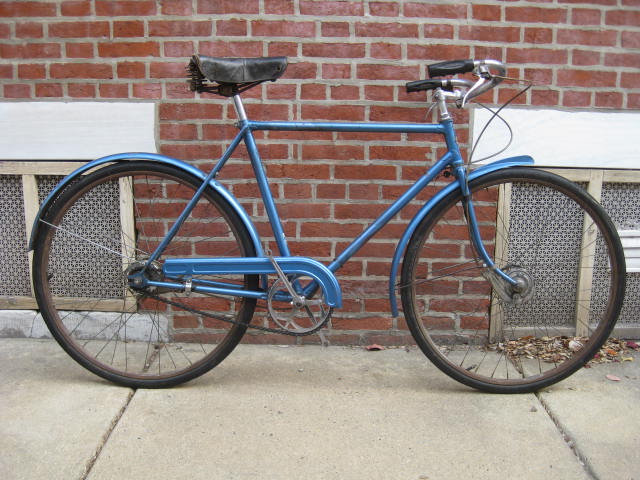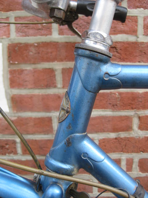 This bike is really cool. It is a Schwinn Paramount tourist model, serial number A634. This is the first serial number system started by Emil Wastyn and the earliest models follow this system. The letter A followed by three digits. This bike dates from roughly the early 1940’s. It was re-painted at some point in its life and has no decals. It does retain the original headbadge. It has the early ball end seat stay caps and the locking Schwinn Superior fork with key. The braze-ons are also attached above the drop outs for the original fenders. The hubs are the post war pork chop drum brake version.